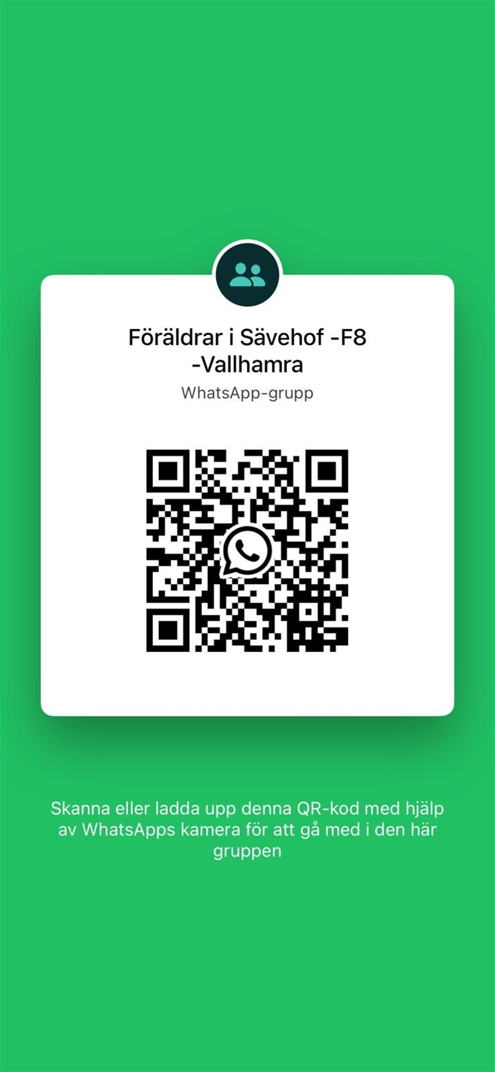 Då vi har en del nya i laget passar vi på att lägga upp en QR-kod för de som vill gå med i den WhatsApp-grupp som finns för er föräldrar. Här kan ni kommunicera med varandra men även ställa frågor till oss ledare. Vill vi nå ut med information snabbt hamnar även den i denna grupp, såväl som i Svenskalag.