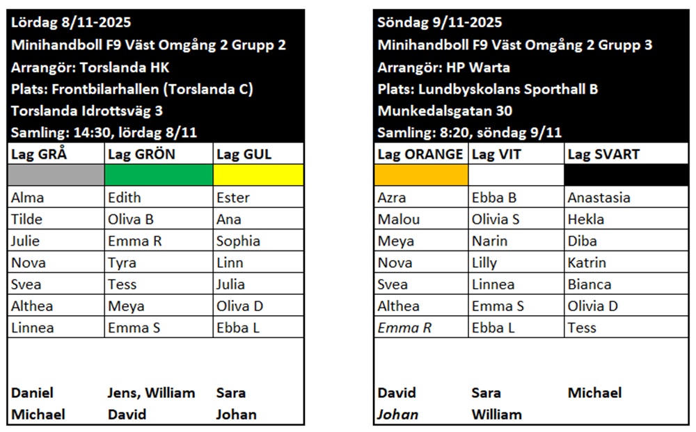 Minihandbollssammandrag omgång 2: 8-9/11: Lag & Tider